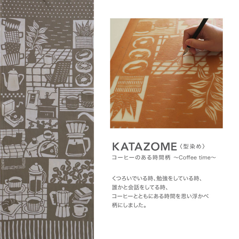 コーヒーのある時間を描いた一枚絵の手ぬぐい。手描きからおこした揺らいだ線は、手染めの掠れや滲みのテクスチャーと相まって独特の絵画的風合いを生み出しています。格子状に区切られたいくつもの日常の風景はインテリアとして飾ってディテールを眺めるのも◎。